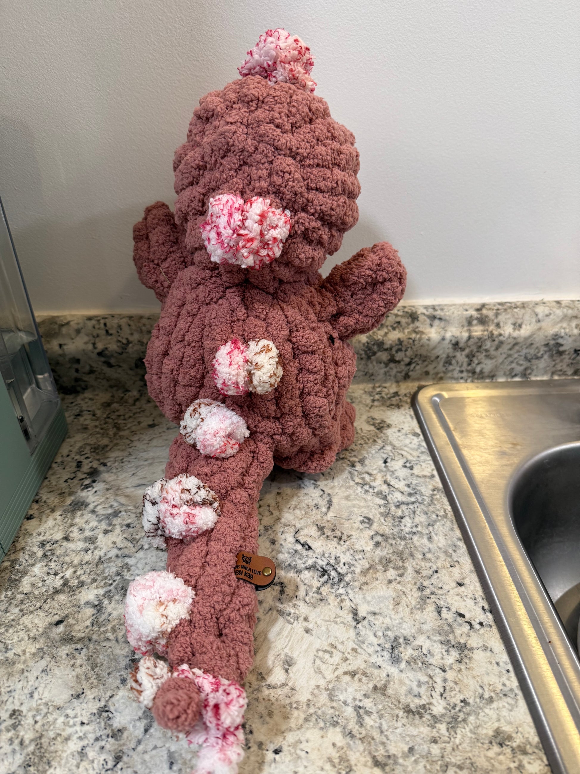 Made with Chunky Knit and hand knitted by me. 12 inches tall