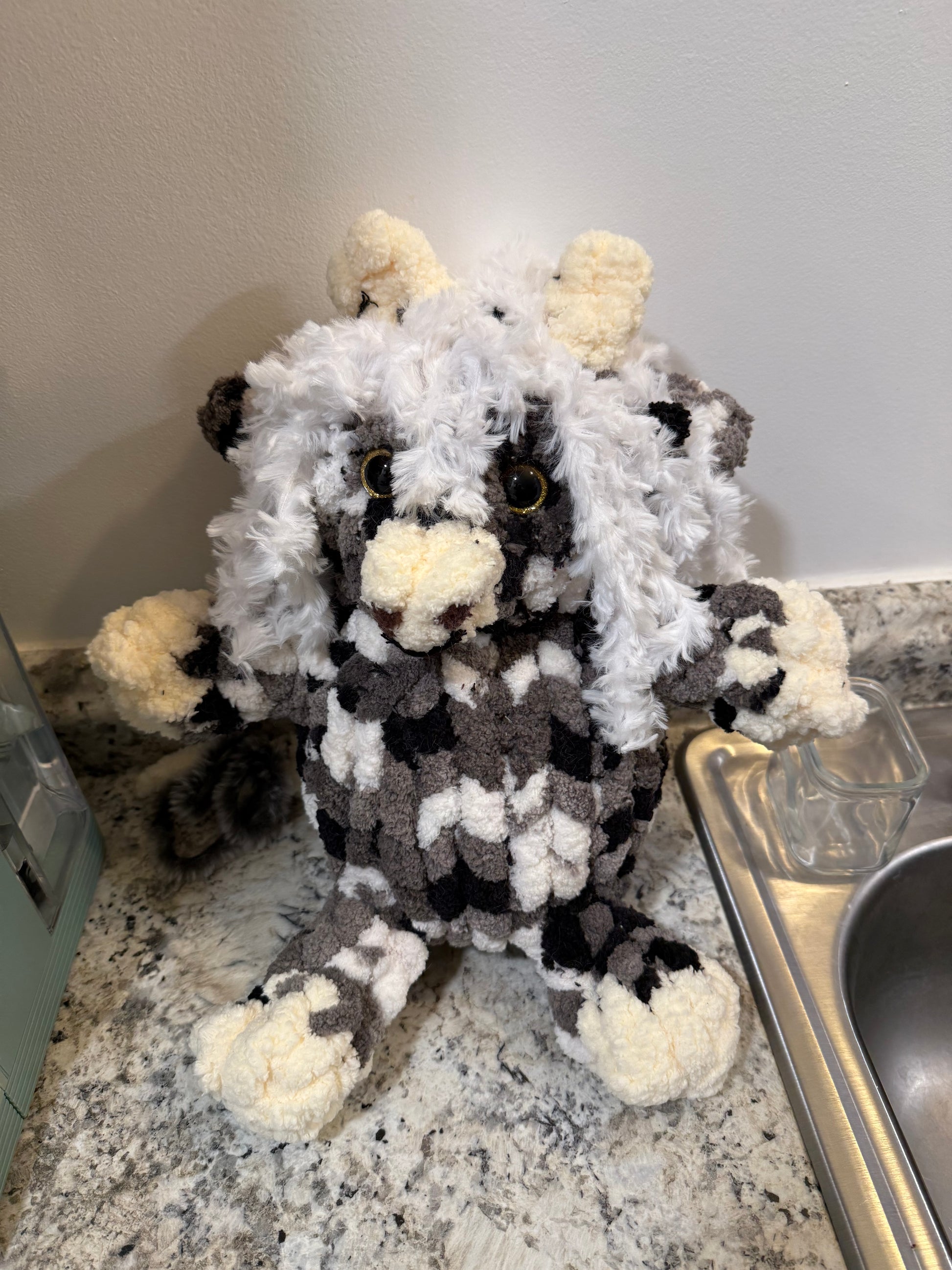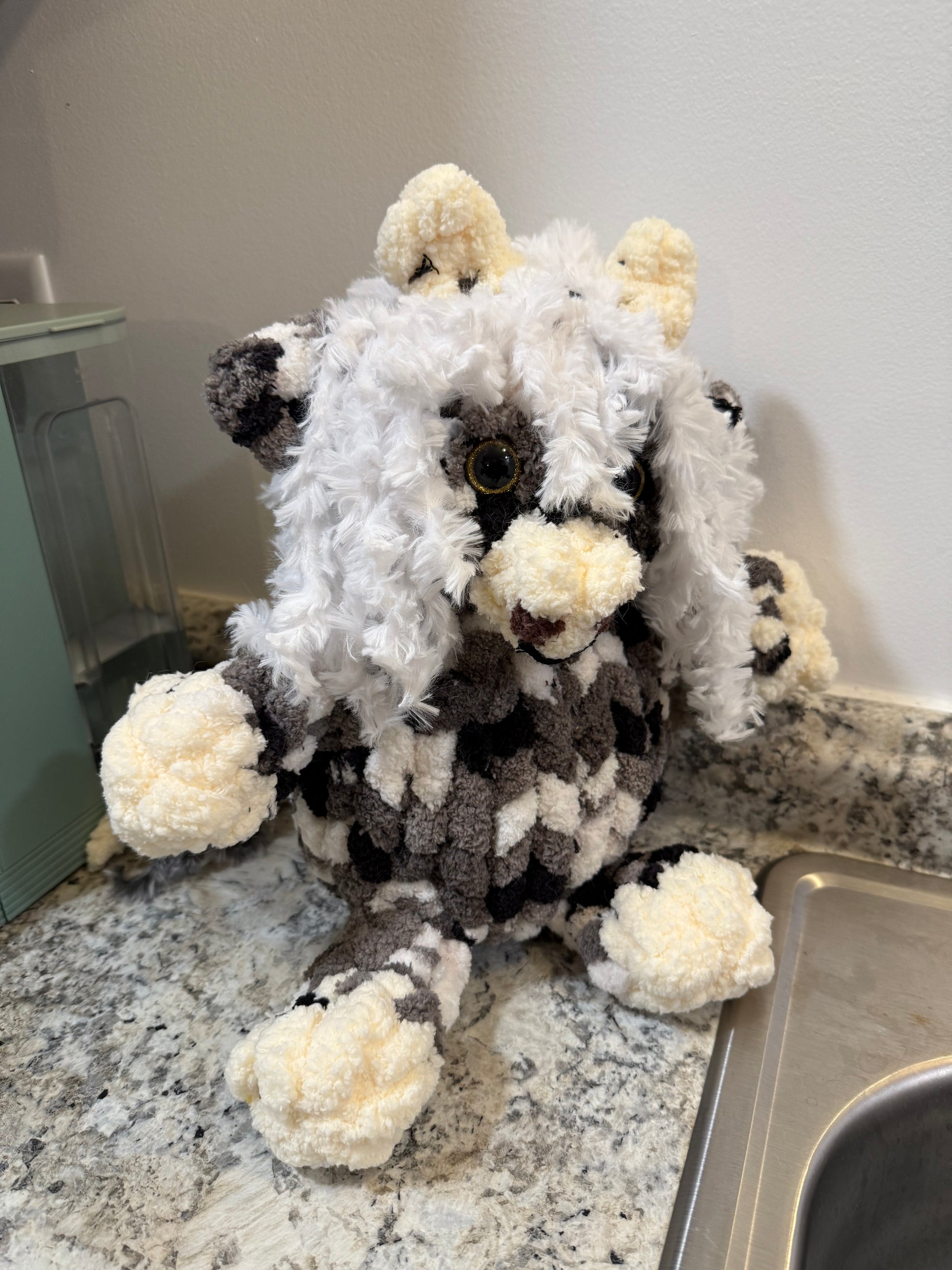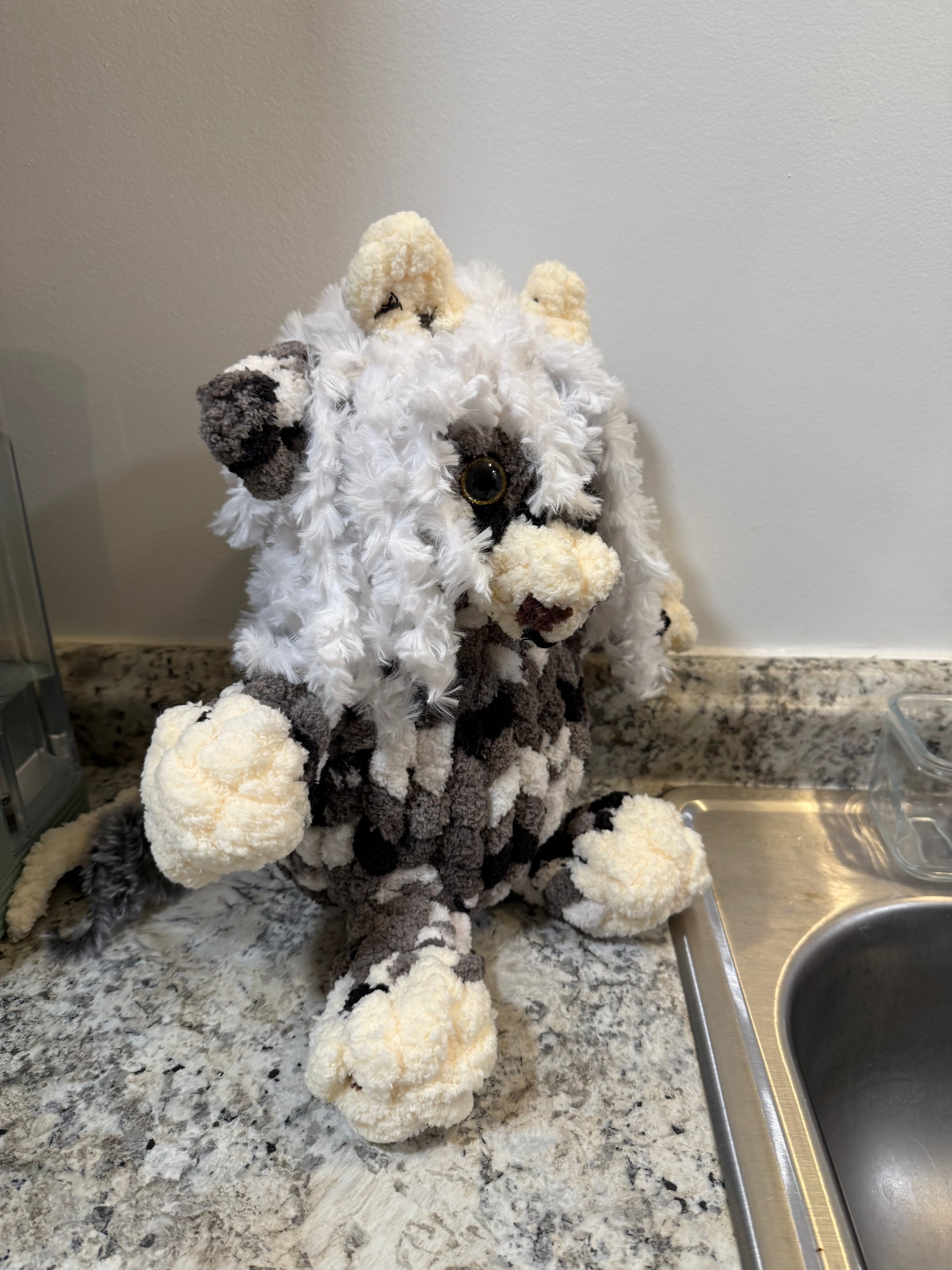 Made special by me! Hand knitted with 100% polyester yarn. Stands about 12 inches tall.