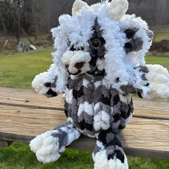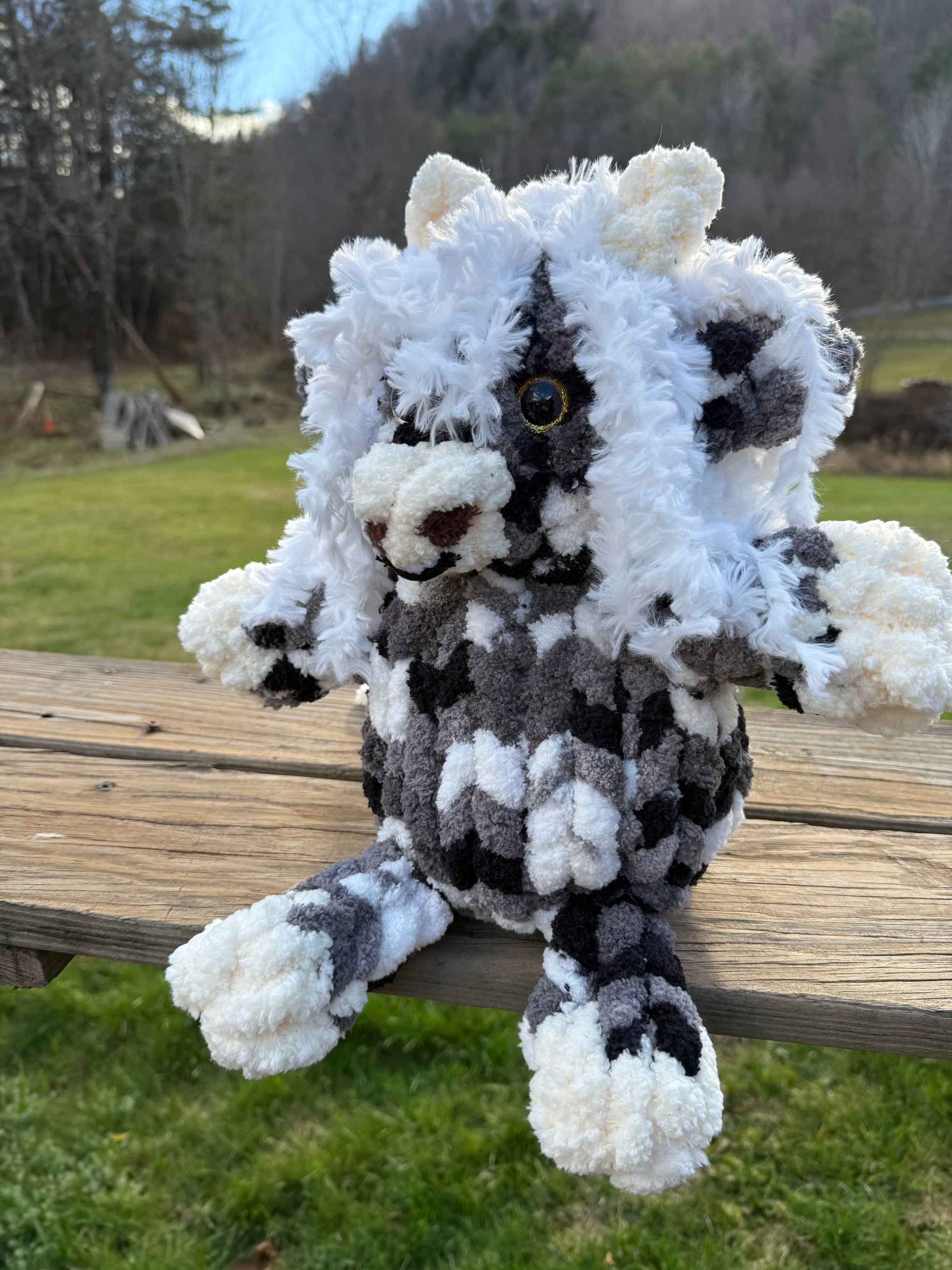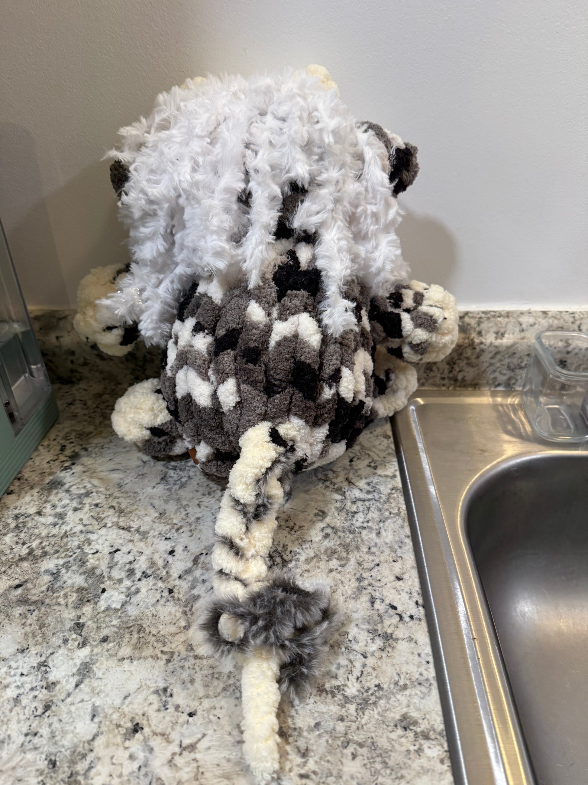 Made special by me! Hand knitted with 100% polyester yarn. Stands about 12 inches tall.