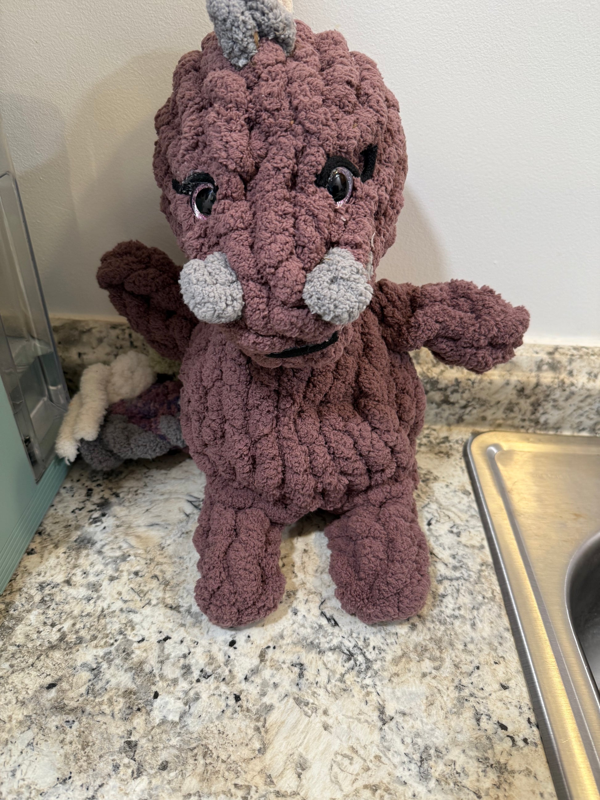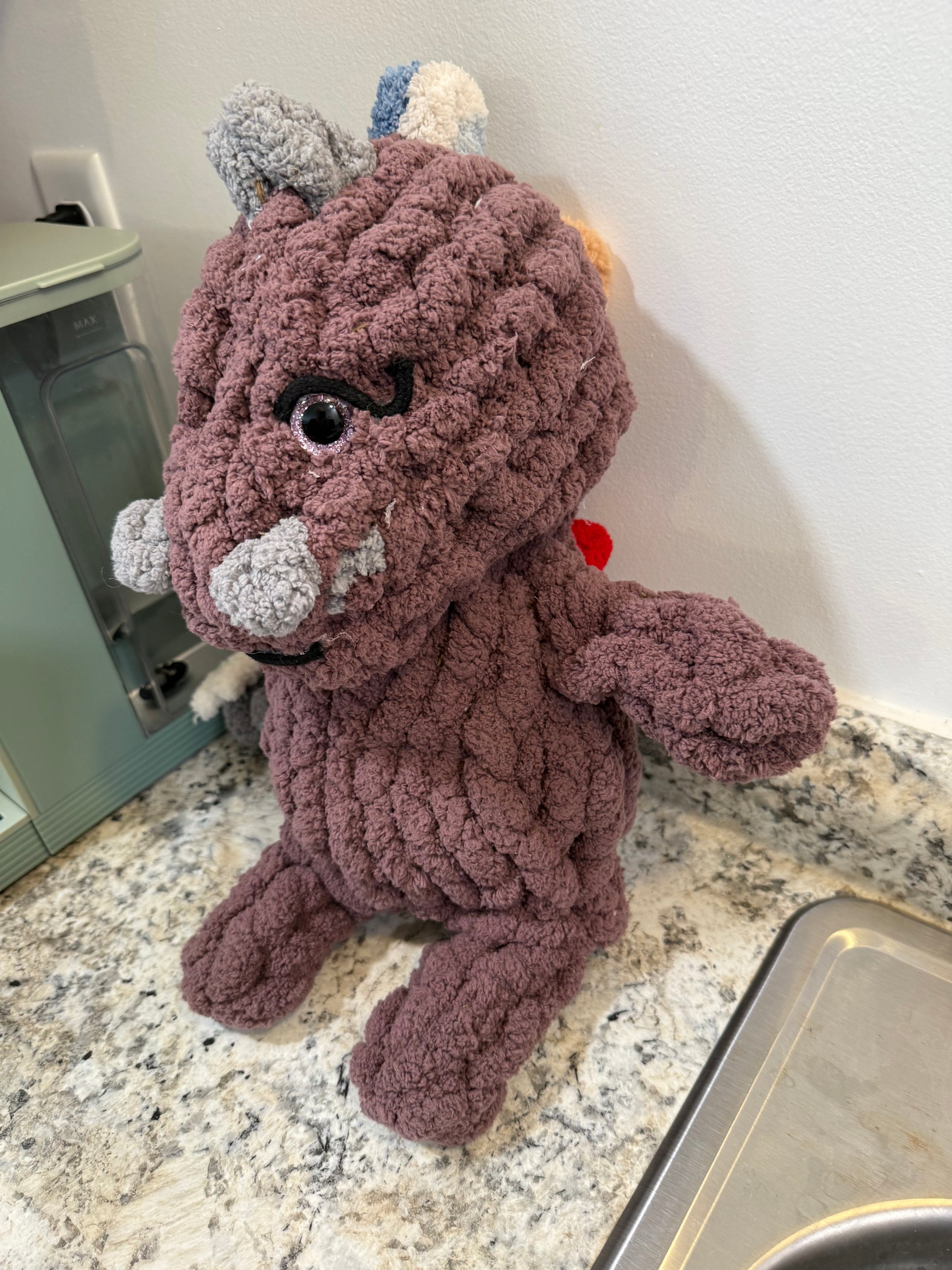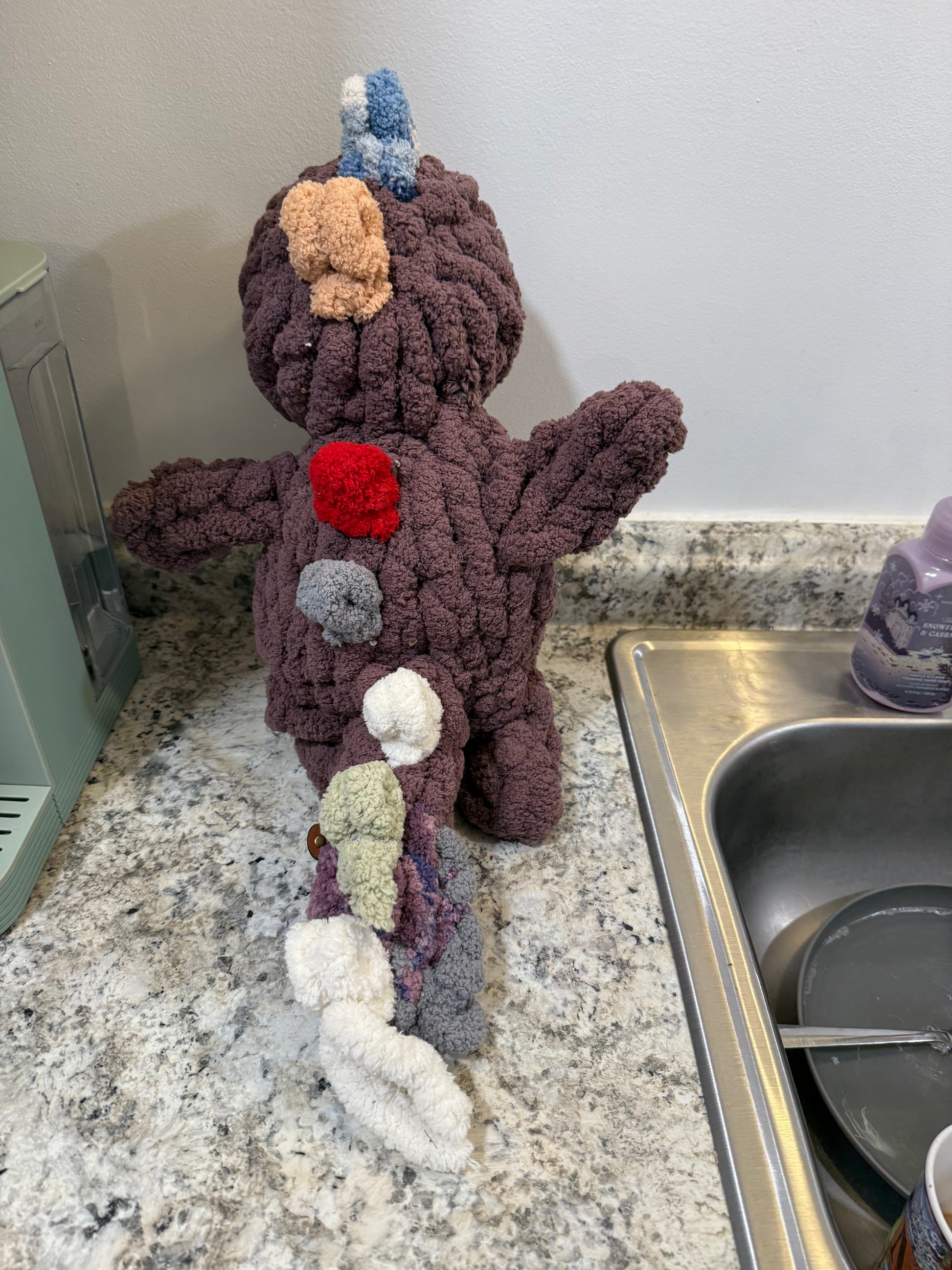 Made with Chunky Knit and hand knitted by me. 12 inches tall