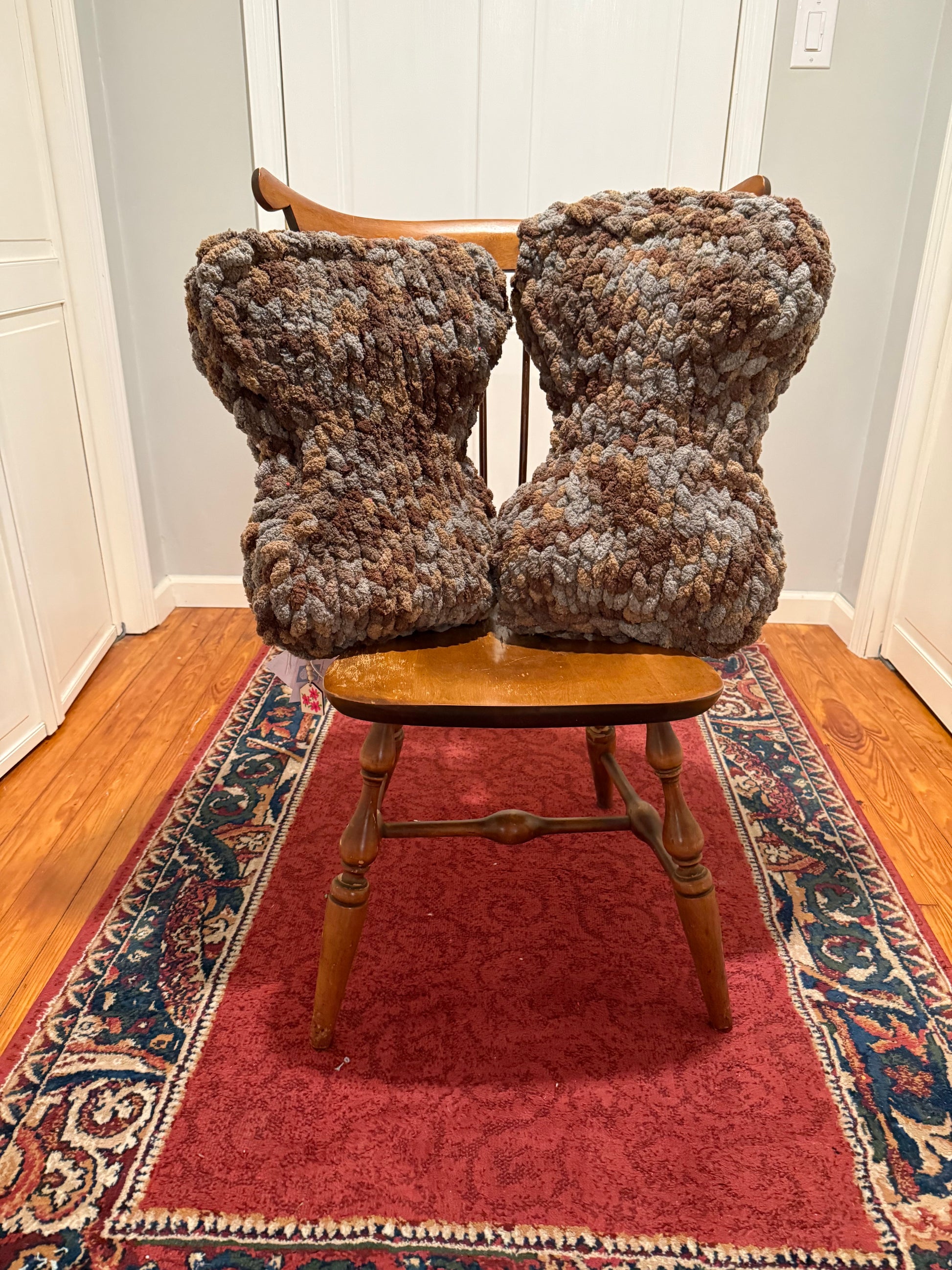 25 by 26 inches and used double yarn for the stitches. 100% polyester yarn. Can be washed in cold water on gentle cycle using a gentle detergent. No Fabric softener but use 1/2 cup white vinegar to skeep it soft. Dry on gentle cycle, low heat and lay flat if needed.